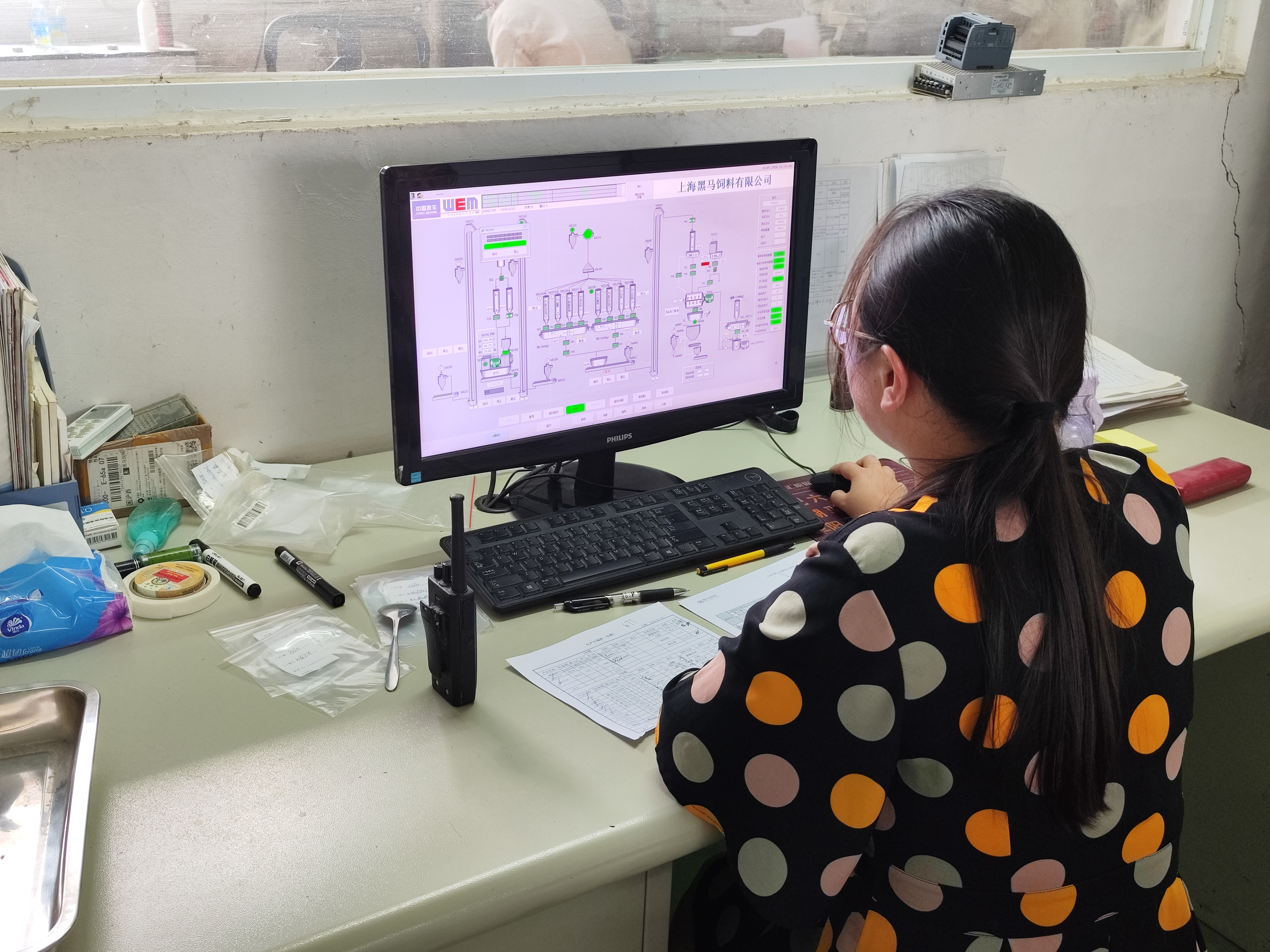 中控就如同整個(gè)生產(chǎn)流程的大腦,只有經(jīng)過(guò)它的授權(quán),一包包完整的飼料才能被生產(chǎn)出來(lái)。因此,在巡查的時(shí)候,要格外認(rèn)真。巡查內(nèi)容主要包括中控人員在崗情況、配料軟件與配方的核對(duì)、混合時(shí)間的設(shè)置工作記錄填寫情況等。