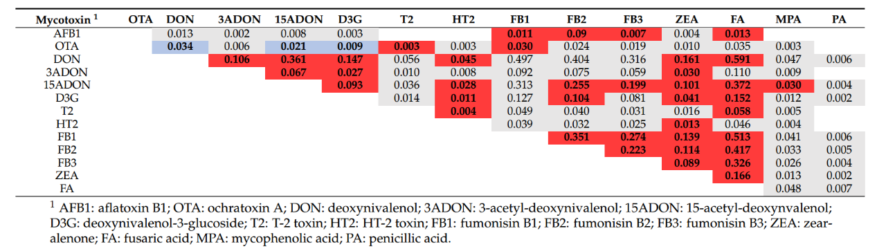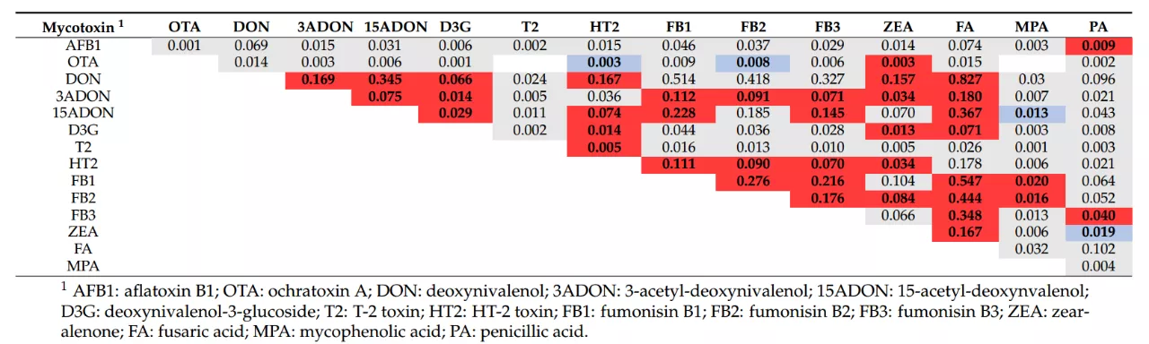據(jù)Weaver等(2021)發(fā)表在Toxins上一篇持續(xù)7年、累計(jì)828個樣品、對35種霉菌毒素的調(diào)查報(bào)告,單胃動物日糧的主要原料玉米樣品(n=711)中,萎蔫酸(FA)和嘔吐毒素(DON)成對出現(xiàn)的概率最大,為0.591(p<0.001)。而萎蔫酸檢出時(shí),伏馬毒素B1、B2、B3(FB1、FB2、FB3)出現(xiàn)的概率較大,分別為0.513(p<0.001)、0.417(p<0.001)、0.326(p<0.001),詳見表1。