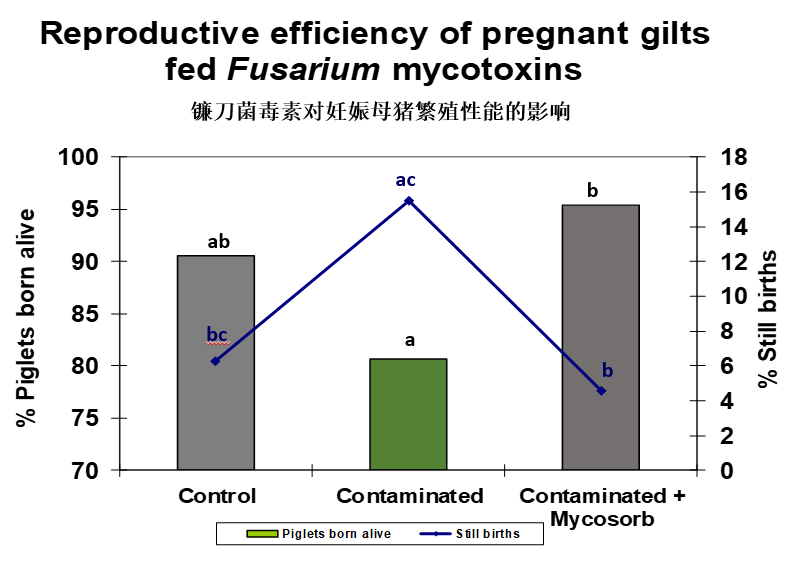 Diaz and Smith等(2006)使用EGM(商品名霉可吸或Mycosorb,奧特奇)研究表明,在含有嘔吐毒素污染(5500 ppb DON+500 ppb 15-Ac-DON+300 ppb ZEA)的妊娠母豬日糧中,添加2 kg霉可吸,可以降低母豬分娩時(shí)體重?fù)p失,提高飼料轉(zhuǎn)化效率,降低死胎比例(圖3-4) 。此外,霉可吸在提高動物免疫性能、降低炎癥反應(yīng)、緩解氧化應(yīng)激等方面也有顯著作用 (Van Le Thanh et al., 2015; Weaver et al., 2014) 。